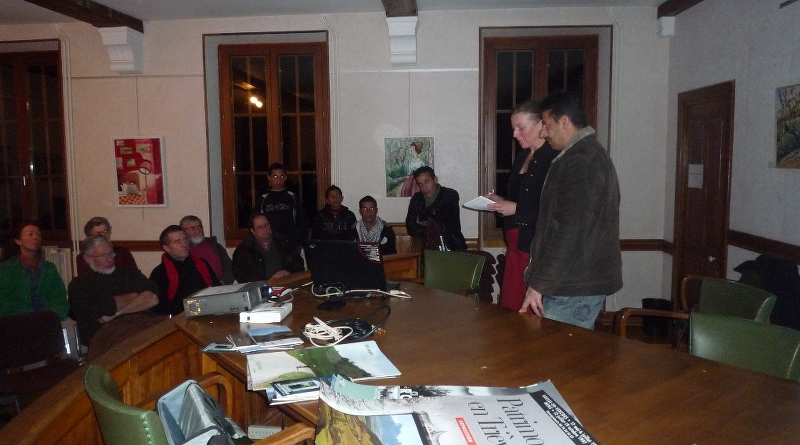 9:30 حتي 11:00: درس اللغة الفرنسية في Granjou في Monestier de Clermont مع ماري وكلوديا. بعد ذلك ، اصطحبت كلوديا الفلسطينين إلى كليليس لترى “آلات الطيران” لسيرج رينو. في الظهيرة ، أعدت سارة وجان بيير هارولد مع بعض الأصدقاء وجبة رائعة لنا جميعًا في منزلهم في لو بيرسي. تابعنا مناقشات حتى الساعة 3 مساءً ، وبعد ذلك ذهبنا إلى مكتبة البلدية ، حيث شرح لنا كلا من جيزيل وساندرين كيفية عمل الأشياء ؛ شاهدنا المعرض المؤقت لنسج السلال. استغلت باتريشيا فلوريت هذه المناسبة لتعرض على المكتبة – بحضور العمدة غيوم غونتارد – ملصق بالشاشة الحريرية للشاعر الفلسطيني الشهير محمود درويش. قرأ أندريه القصيدة وترجمها جمعة الذي بدا متأثراً للغاية. بعد ذلك ذهبنا إلى مركز بيرسي المجتمعي ، حيث اقترح سكان القرية ورئيس البلدية أن نشارك الطعام “جاليت ديس رويس” (للاحتفال المسيحي بعيد الغطاس). من بيرسي مشينا عدة كيلومترات إلى مزرعة باتريك في Longefonds ، حيث ساعد الفلسطينيون بعد زيارة المزرعة في حلب الأبقار. بعد العشاء في كاثرين وباتريك ، قمنا بقشر الجوز ، وكل ذلك بينما كنا نغني باللغتين العربية والفرنسية. لا يزال صدى الجدران بالتأكيد يتردد مع أغانينا.